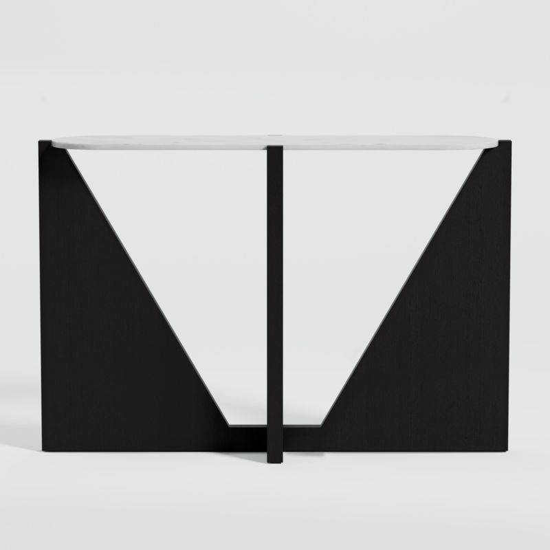The white marble top of our Miro console table stuns with grey veining, presented like a precious gem set within the prongs of a ring. Inspired by sculptural bronze tables from the 1970s, Miro's dynamic geometry plays with negative space in an airy arrangement of angular panels that support the capsule-shaped marble slab. Ebonized oak veneer with vertical quartersawn grain is heavily wirebrushed to emphasize the base's linear look. Ideal in an entryway or behind a sofa, the white marble console table is part of our exclusive Miro collection, which mixes and matches bases and tabletops in modern, elevated combinations.
