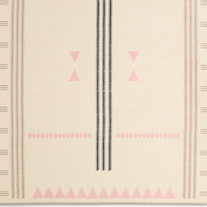 Make a graphic statement in your kid's favorite spaces with this striking rug that boasts a handwoven, silk-like texture and lustrous sheen. Pink geometric shapes and grey and beige stripes in contrasting weaves give this rug beautiful dimension and depth. Its abstract design and cotton-chenille blend is perfect for centering a space with sophisticated style and plush cushioning.