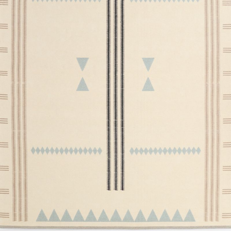 Make a graphic statement in your kid's favorite spaces with this striking rug that boasts a handwoven, silk-like texture and lustrous sheen. Mist blue geometric shapes and grey and beige stripes in contrasting weaves give this rug beautiful dimension and depth. Its abstract design and cotton-chenille blend is perfect for centering a space with sophisticated style and plush cushioning.