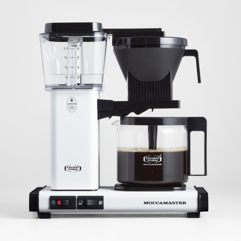 The Moccamaster KBGV glass brewer makes a 40-ounce pot of coffee in just four to six minutes, and then keeps it at precisely the right temperature for over an hour and a half. Crafted exclusively for Crate & Barrel in matte white, this brewer suits the modern kitchen. The pre-immersion, drip-style system creates the perfect coffee bloom for optimal flavor extraction, and the automatic drip-stop feature lets you steal a sip of coffee before the full carafe is ready. Treat yourself to 10 cups of impeccably brewed coffee that exceeds the Specialty Coffee Association's rigorous Golden Cup standards.