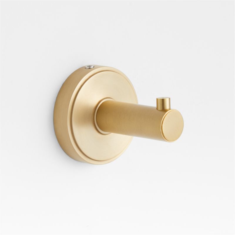 Sometimes it's the small things that pull a room together. That's why we've designed a hardware collection with modern silhouettes and a touch of tradition to give your bathroom that perfect finishing touch. Grooved detailing and a brushed finish lend an industrial vibe to this brass towel hook. Constructed as a series of cylinders, the hook has an understated geometry that we love. Provided hardware makes it easy to refresh the look of bathrooms and powder rooms.