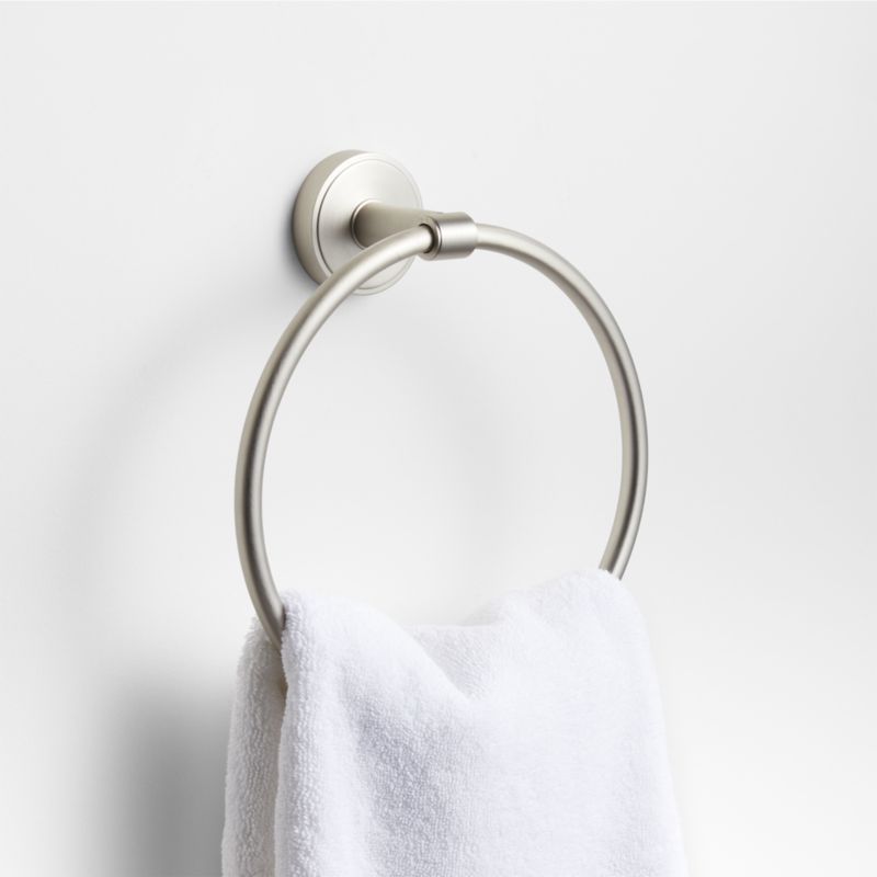 Sometimes it's the small things that pull a room together. That's why we've designed a hardware collection with modern silhouettes and a touch of tradition to give your bathroom that perfect finishing touch. Grooved detailing and a brushed nickel finish lend an industrial vibe to this hand towel ring. Anchored to the wall by a scaled-up circle, the round brass towel hanger has an understated geometry that we love. Provided hardware makes it easy to refresh the look of bathrooms and powder rooms.