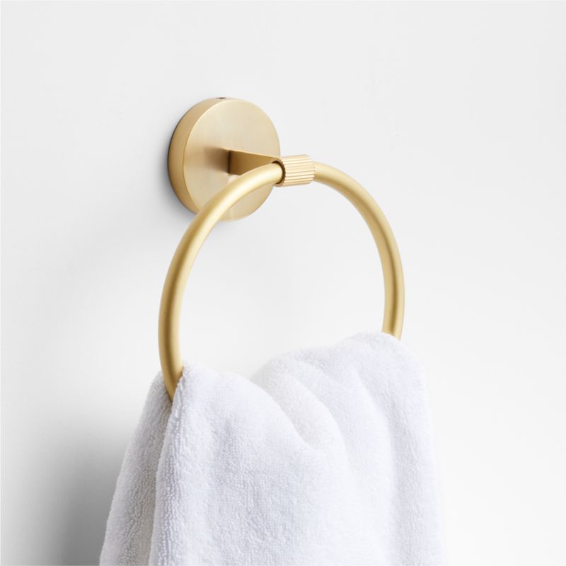 Sometimes it's the small things that pull a room together. That's why we've designed a hardware collection with modern silhouettes, clean lines and a touch of tradition to give your bathroom that perfect finishing touch. Made of brushed brass, this towel ring lends industrial chic to its minimalist design. The towel holder threads a perfect circle through a fluted tube that extends from a flat bar anchored to a circular mount for an intriguing mix of rounded edges, smooth surfaces and texture. The hand towel ring easily fastens to the wall with included hardware.