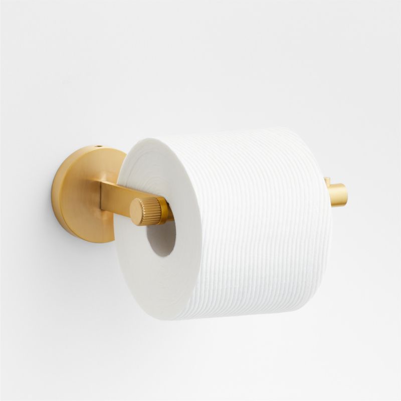 Sometimes it's the small things that pull a room together. That's why we've designed a hardware collection with modern silhouettes, clean lines and a touch of tradition to give your bathroom that perfect finishing touch. Made of brushed brass, this toilet paper holder lends industrial chic to its minimalist design. Extending from a flat bar anchored to a circular mount, the round bar is capped with a fluted end for a bit of texture. Open ended to facilitate paper roll changes, the wall-mounted holder installs easily with included hardware.