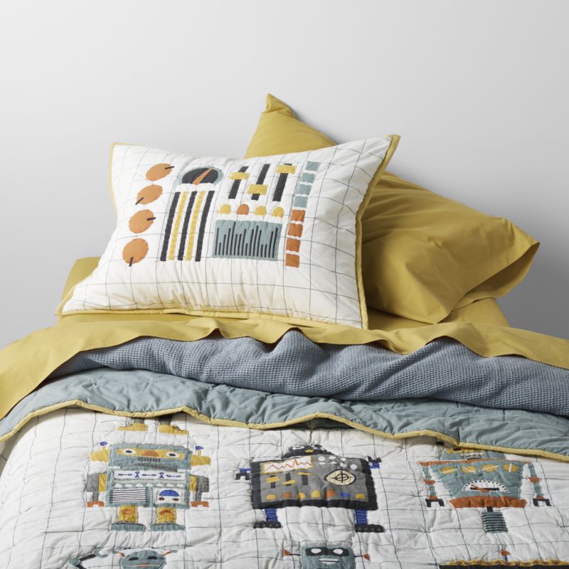 Want to get kids excited about bedtime? Layer their bed with a playful quilt that embraces what they love. Our Modern Robot Quilt features nine graphic droids, specially programmed in colorful appliques and embroidered details to wish sweet dreams to your little one. Oh-so soft organic cotton, complete with hand-quilting, delivers the perfect amount of all-season warmth and comfort. Finish off the bedtime fun with our coordinating Modern Robot Organic Cotton Pillow Sham and Sheet Set.