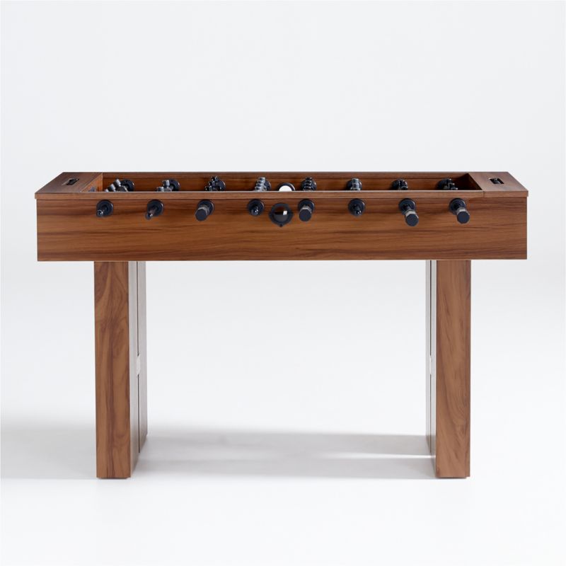 An arcade classic comes home. Updated with a modern look, this foosball table offers the all-ages fun of a fast-paced favorite in a style that fits your space—game room, loft or finished basement. The graphic black-and-white playing field hosts two teams of competitors in sleek black and grey, while the faux bois frame adds a touch of warmth. Two to four players can compete at one time, using the charming manual scoring system to declare a winner.