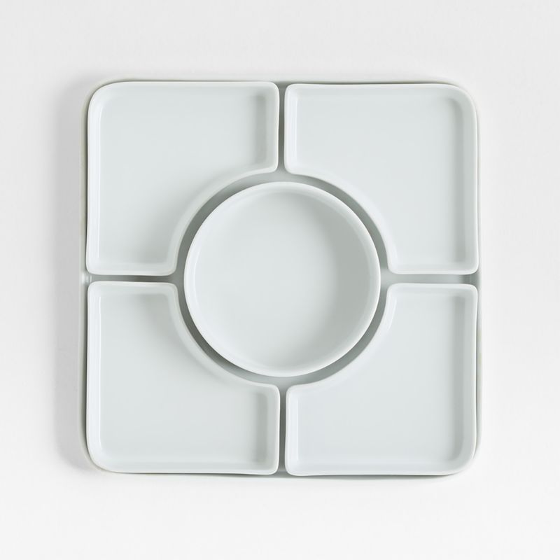 Our white modular serving set includes a large serving tray, bowl and four bowls, all fitting neatly together or split up for serving any combination of chips, appetizers, veggie and dips.