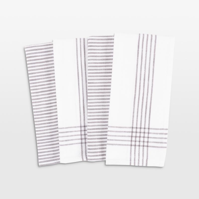 Inspired by farmhouses in the French Riviera, this set of four Monaco dish towels elevates your everyday kitchen tasks. Cool grey lines on crisp white pattern the soft, slubby cotton for a fresh-yet-timeless, elegant-yet-rustic look. Prewashed for extra softness, the ultra-plush fabric dries hands, dishes and countertops with ease. This set includes two striped and two plaid kitchen towels for effortless mixing and matching. Keep extras on hand to wrap wine bottles as charming host gifts.