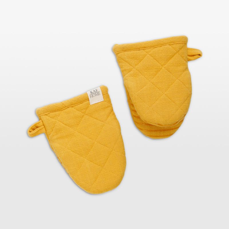 Inspired by farmhouses in the French Riviera, this pair of Monaco mini mitts elevates everyday cooking, baking and serving. Yarn-dyed cotton in sunny ocher weaves the grabbers, while textured silicone grips and generous quilting provide a safe, sturdy grip on hot pots, pans and baking dishes. Pair with the matching golden yellow dish towels and oven mitts for a coordinated kitchen.
