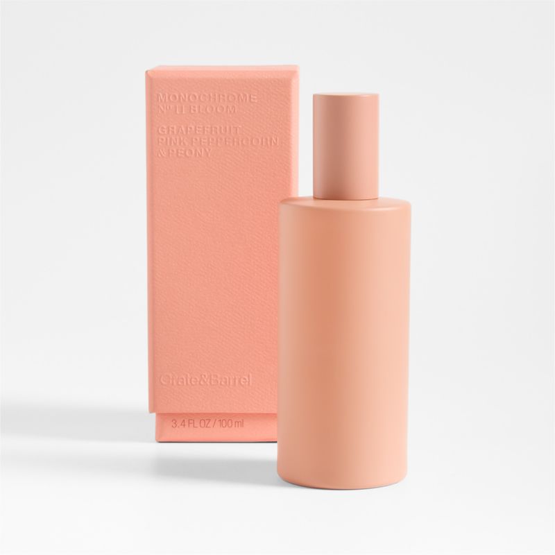 Utterly modern in monochromatic peach. Our room spray infuses the air with the sweet, invigorating scents of peony, pink peppercorn, peach and citrus, grounded by patchouli and amber. The nozzle releases the perfect amount of fragrance for the ideal level of ambient scent. Packaged in a pink-orange gift box, the matching matte glass vessel has a clean, crisp look that warms your coffee table, dresser or mantel. Part of our Monochrome scent collection, the No. 11 Bloom room spray is a Crate & Barrel exclusive.