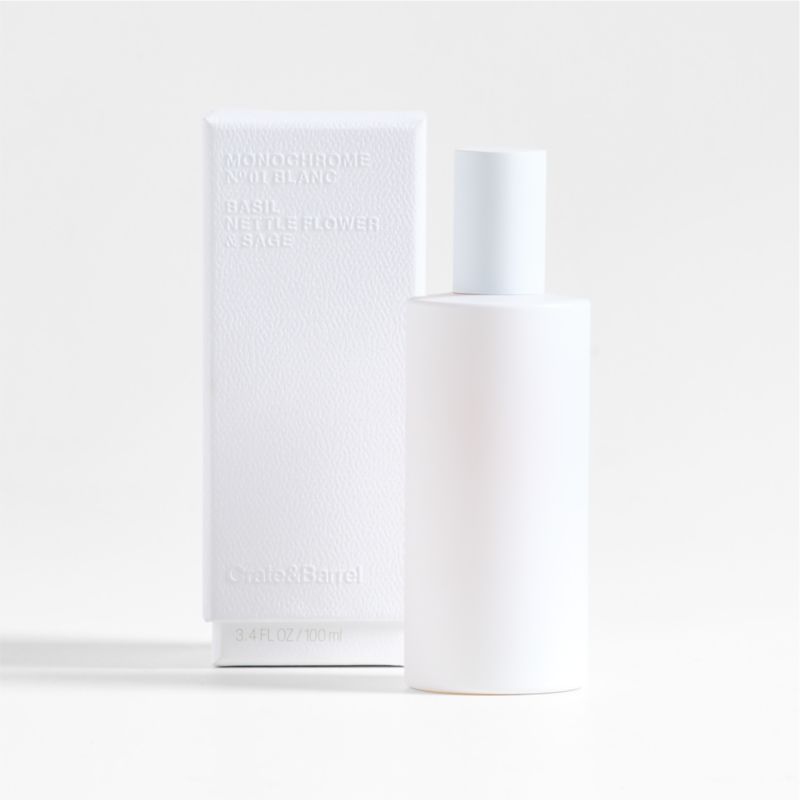 Utterly modern in monochromatic white. Our room spray infuses the air with the fresh scents of lemon zest, mint and basil grounded by the richness of sage, cashmere wood and musk. The nozzle releases the perfect amount of fragrance for the ideal level of ambient scent. Packaged in a white gift box, the white glass vessel has a clean, crisp look that brightens your coffee table, dresser or mantel. Part of our Monochrome scent collection, the No. 01 Blanc room spray is a Crate & Barrel exclusive.