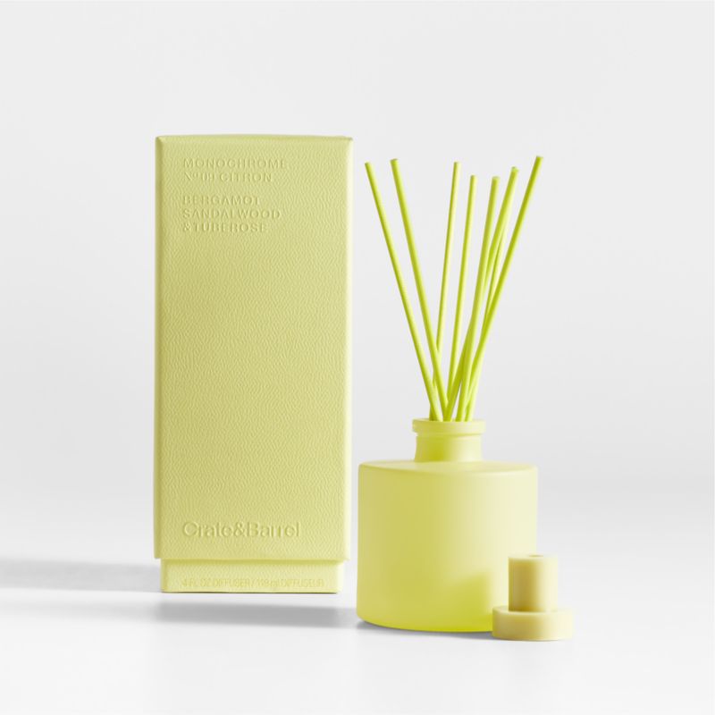Utterly modern in monochromatic yellow. Our reed diffuser infuses the air with the fresh scents of bergamot and mandarin and the sweetness of jasmine and tuberose grounded by sandalwood and musk. The diffuser's reeds absorb the oil and release the aroma gradually for the ideal level of scent. To refresh the fragrance, simply jiggle the reeds, or take them out and put them back in upside down. Packaged in a lemon-yellow gift box, the matching matte glass vessel has a clean, fresh look that brightens your coffee table, dresser or mantel. Part of our exclusive Monochrome scent collection, the No. 9 Citron Yellow diffuser is a Crate & Barrel exclusive.