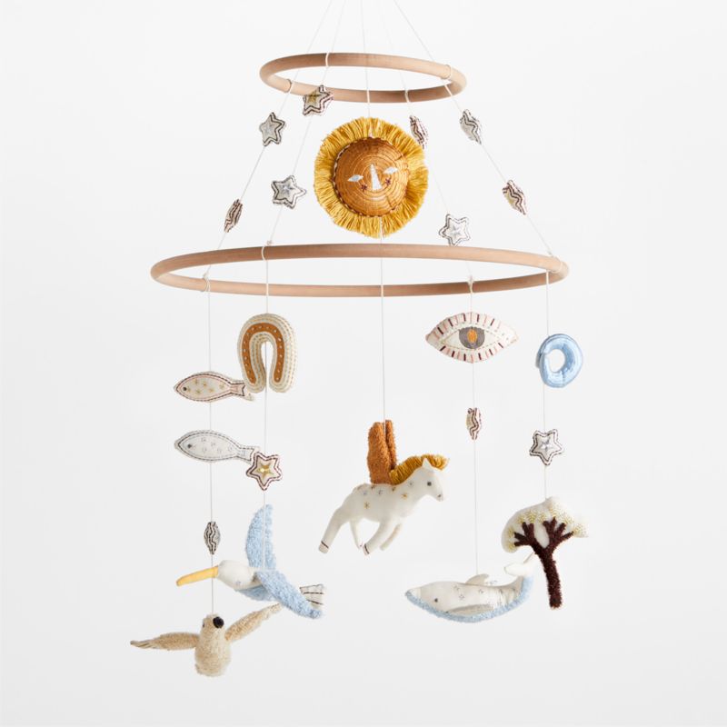 Our Montcalm Baby Mobile by Jeremiah Brent brings a dream-like quality to the nursery. Inspired by Jeremiah's childhood and his own kids' imaginings, the mobile features a winged pegasus, a lucky horseshoe and other symbols of myth and good fortune, all floating beneath a golden sun and twinkling stars. Each piece is made of natural flecked organic cotton and decorated with intricate embroidery and metallic accents.