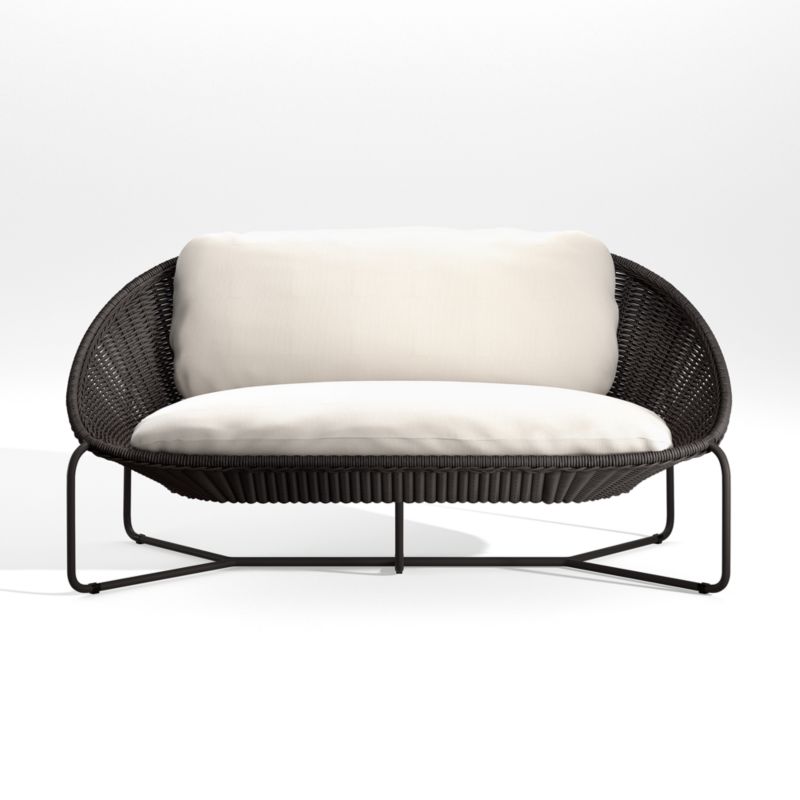 When it comes to relaxing outdoors in affordable modern style, our laid-back Morocco collection knows the ropes. Oval outdoor loveseat is weather-resistant resin rope hand-wrapped over an aluminum, powdercoated steel frame in graphite. Comfy cushions add a layer of plush. The Morocco Graphite Oval Outdoor Lounge Chair with Cushion is a Crate and Barrel exclusive.