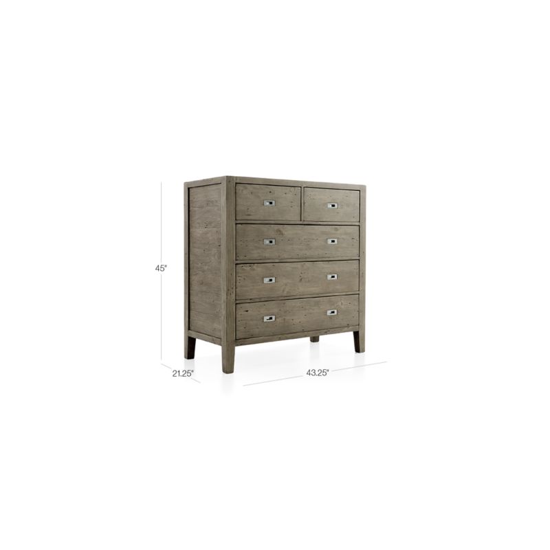 The chest features two medium-sized drawers atop three large drawers, providing plentiful storage. Drawers are accented with iron pulls with an antique nickel finish. An optional hutch is also available. The Morris Ash Grey 5-Drawer Chest is a Crate and Barrel exclusive.