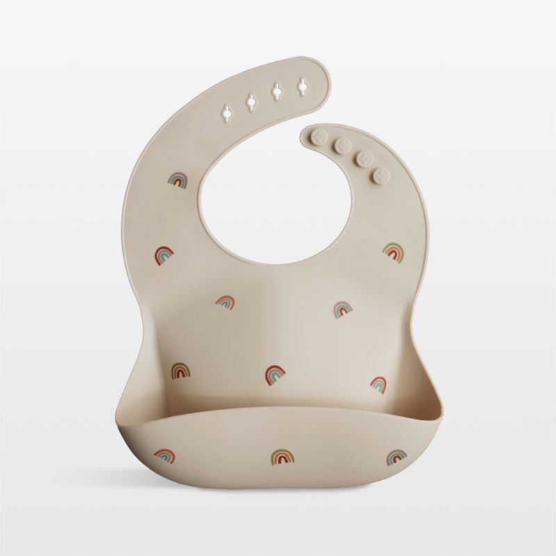 Dress for dinner. This silicone baby bib keeps the littlest gourmands—and your furniture and floor—clean and dry as they master their dining skills. Made of food-grade silicone that resists stains and repels liquids, the bib curves into a deep pocket that catches crumbs, spills and more. The modern, creamy vanilla design is decorated with cute, colorful rainbows. It fits snugly thanks to adjustable neck fasteners and cleans up easily with a quick wash after snack time and meals.