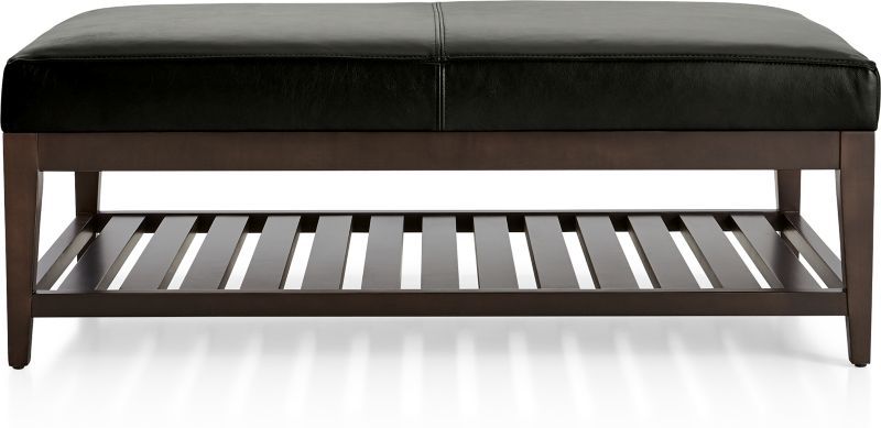 Parked in front of a sofa or sectional, this rectangular ottoman doubles up as an extra seat or cocktail table. Neatly tailored with topstitching, the leather-upholstered ottoman offers a slotted shelf for books or baskets. Nash's clean lines and soft leather texture bring warmth and style to the casual living room.The Nash Leather Rectangular Ottoman with Slats is a Crate and Barrel exclusive.