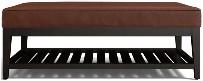 Parked in front of a sofa or sectional, this rectangular ottoman doubles up as an extra seat or cocktail table. Neatly tailored with topstitching, the leather-upholstered ottoman offers a slotted shelf for books or baskets. Nash's clean lines and soft leather texture bring warmth and style to the casual living room.The Nash Leather Rectangular Ottoman with Slats is a Crate and Barrel exclusive.