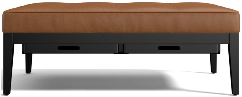 Parked in front of a sofa or sectional, our rectangular ottoman is entertainment central. Nash doubles up as an extra seat or cocktail table and offers two removable serving trays, cleverly concealed under its cushioned top. Upholstered in leather, the ottoman is neatly tailored with topstitching and buttonless tufting.