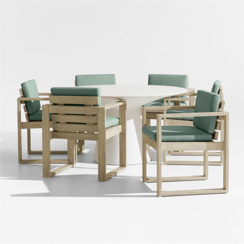 We've paired our Nayarit table with the coastal style of our Mallorca dining chairs for an instant upgrade to your outdoor living space. Featuring a tapered pedestal base and smooth-honed top, the table is made of a concrete and fiberglass mix that showcases unique patterns and textures of the mold impressions, seams, pinholes and swirls created during the curing process. Planks of durable, sustainably sourced eucalyptus wood shape the six chairs with slatted seats and backs on minimalist sleigh legs that continue into arm rests. All-weather seat-and-back cushions add a comfortable layer.