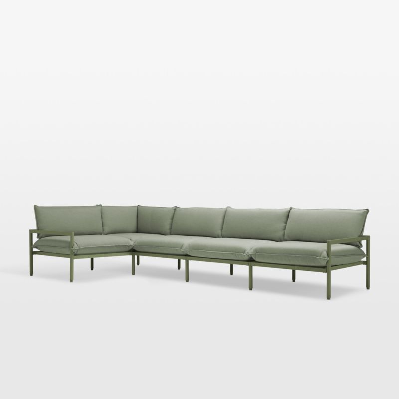 Minimalist in design, maximal in comfort. This five-piece outdoor sectional relaxes with pillowy cushions that sit deep and comfy with down-like softness. The clean-lined aluminum frames match the tone of the weather-resistant Sunbrella upholstery with a matte finish in durable powdercoat. Made for lounging, the sectional is lightweight yet sturdy.
