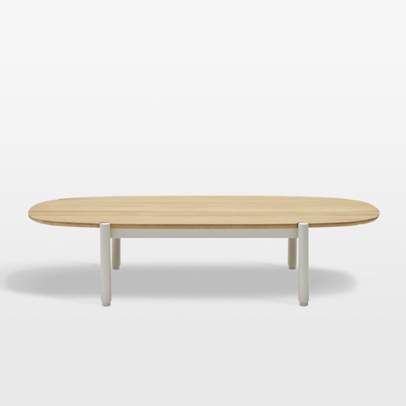 The mixed-material coffee table graces outdoor spaces with living-room style and all-weather durability. Slats of sustainably sourced teak fashion the oval top, tucked into a clean-lined aluminum frame with a matte powdercoat finish in neutral putty. The long, low-profile table sits comfortably before a sofa, sectional or grouping of chairs.