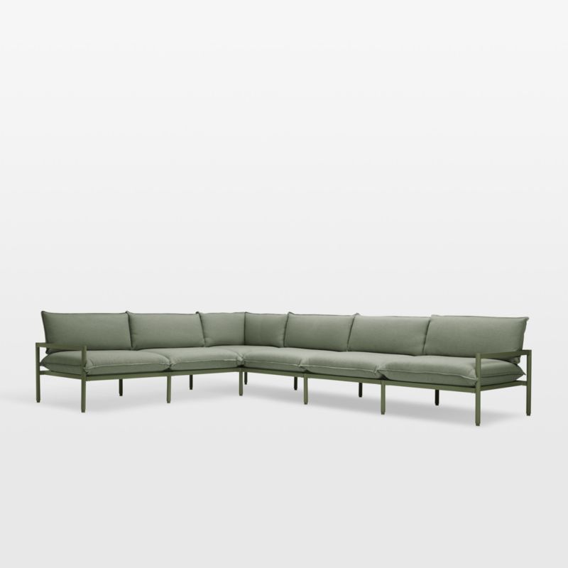 Minimalist in design, maximal in comfort. This six-piece outdoor sectional relaxes with pillowy cushions that sit deep and comfy with down-like softness. The clean-lined aluminum frames match the tone of the weather-resistant Sunbrella upholstery with a matte finish in durable powdercoat. Made for lounging, the L-shaped sectional is lightweight yet sturdy.