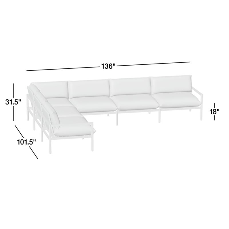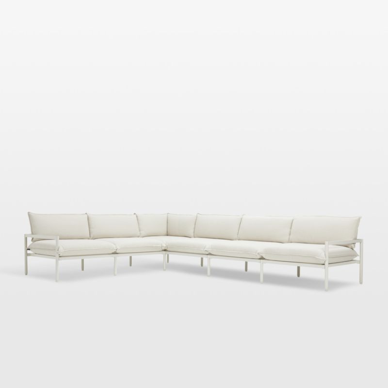 Minimalist in design, maximal in comfort. This six-piece outdoor sectional relaxes with pillowy cushions that sit deep and comfy with down-like softness. The clean-lined aluminum frames match the tone of the weather-resistant Sunbrella upholstery with a matte finish in durable powdercoat. Made for lounging, the L-shaped sectional is lightweight yet sturdy.