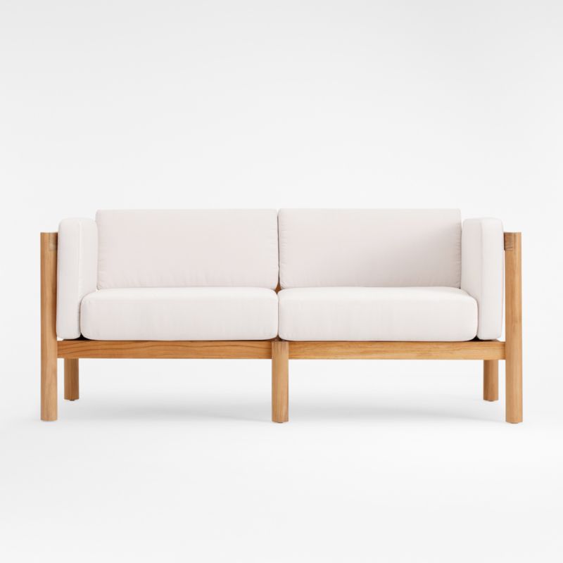 Angled at a slight recline, this deep-seated loveseat invites you to kick back and enjoy the great outdoors. Boxy seat and back cushions are curl-up comfy, while the sofa's slim side bolsters add a soft layer for draping arms. Natural teak shapes the chunky, rounded frame complemented by a hand-stretched polyester rope back. Offering living-room looks with surprising durability, the outdoor loveseat withstands the elements in weather-resistant teak and fast-drying foam cushions.