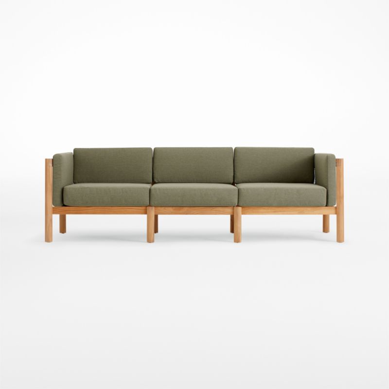 Angled at a slight recline, this deep-seated sofa invites family and friends to kick back and enjoy the great outdoors. Boxy seat and back cushions upholstered in sage green are curl-up comfy, while the sofa's slim side bolsters add a soft layer for draping arms. Natural teak shapes the chunky, rounded frame complemented by a hand-stretched polyester rope back. Offering living-room looks with surprising durability, the outdoor sofa withstands the elements in weather-resistant teak and fast-drying foam cushions.