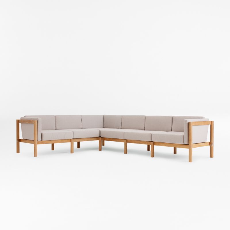 This large, deep-seated sectional sofa invites family and friends to kick back and enjoy the great outdoors. Boxy seat and back cushions upholstered in silvery grey are curl-up comfy, while the sofa's slim side bolsters add a soft layer for draping arms. Natural teak shapes the chunky, rounded frames complemented by hand-stretched polyester rope backs that angle slightly for a comfortable recline. Offering living-room looks with surprising durability, the L-shaped outdoor sectional withstands the elements in weather-resistant teak and fast-drying foam cushions.