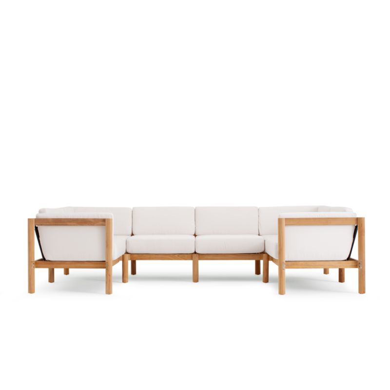 Space-saving yet deep-seated, this sectional sofa invites family and friends to kick back and enjoy the great outdoors. Boxy seat and back cushions upholstered in a light neutral are curl-up comfy, while slim side bolsters add a soft layer for draping arms. Natural teak shapes the chunky, rounded frames complemented by hand-stretched polyester rope backs that angle slightly for a comfortable recline. Offering living-room looks with surprising durability, the U-shaped outdoor sectional withstands the elements in weather-resistant teak and fast-drying foam cushions.