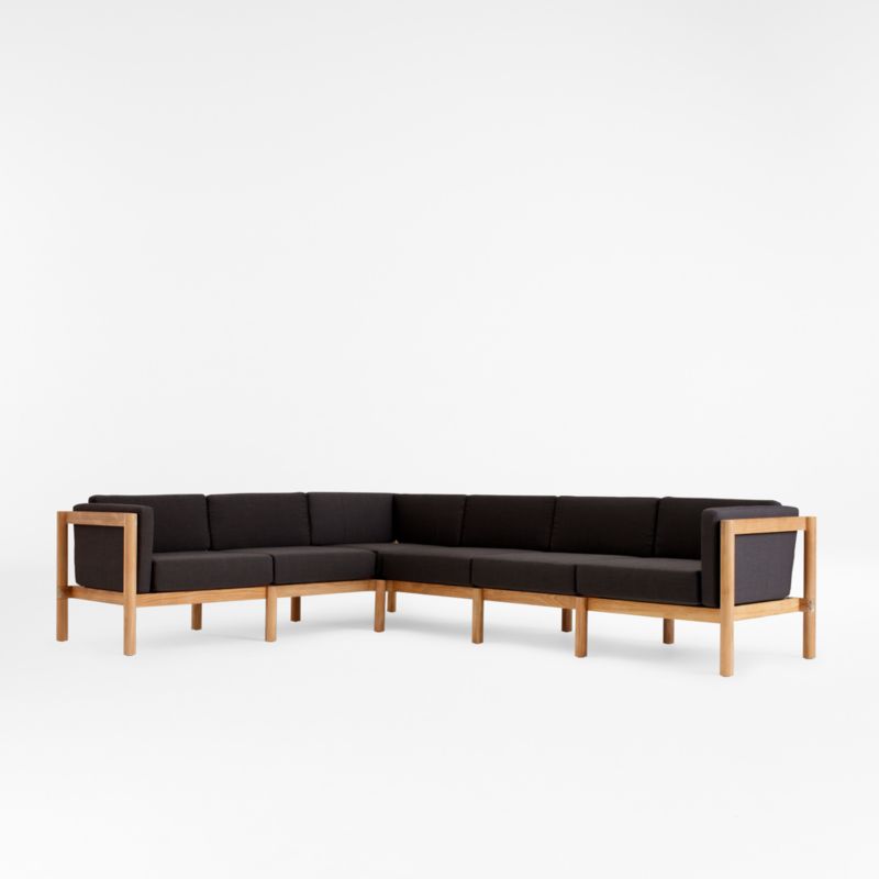 This large, deep-seated sectional sofa invites family and friends to kick back and enjoy the great outdoors. Boxy seat and back cushions are curl-up comfy, while the sofa's slim side bolsters add a soft layer for draping arms. Natural teak shapes the chunky, rounded frames complemented by hand-stretched polyester rope backs that angle slightly for a comfortable recline. Offering living-room looks with surprising durability, the L-shaped outdoor sectional withstands the elements in weather-resistant teak and fast-drying foam cushions.