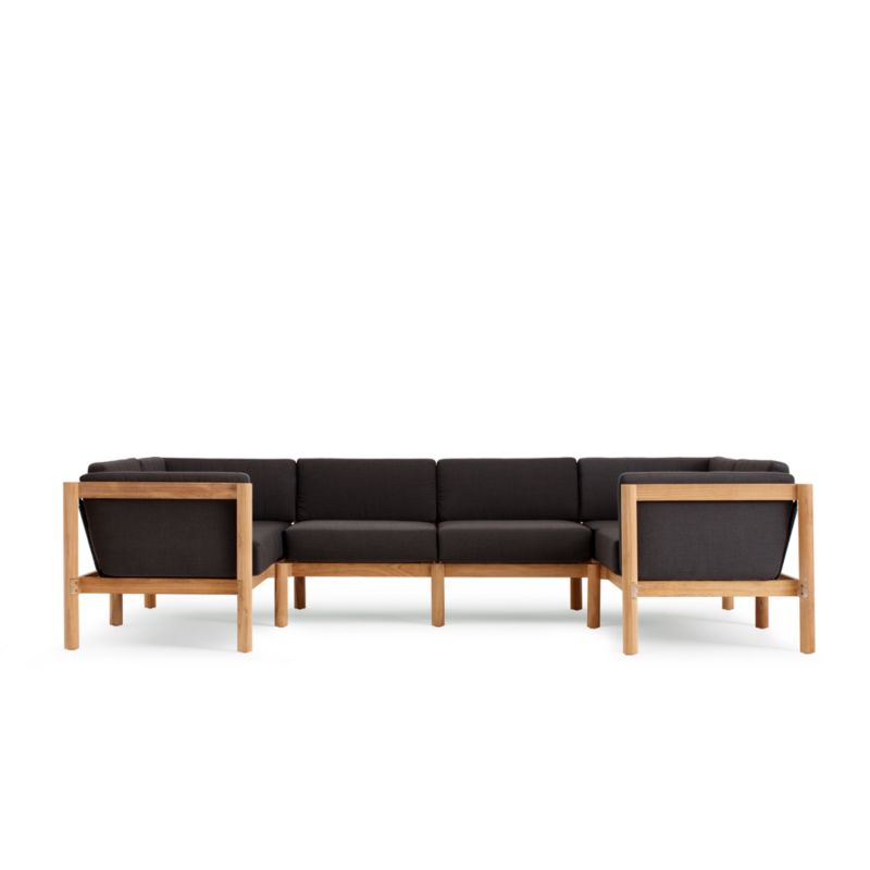 Space-saving yet deep-seated, this sectional sofa invites family and friends to kick back and enjoy the great outdoors. Boxy seat and back cushions upholstered in leafy green are curl-up comfy, while slim side bolsters add a soft layer for draping arms. Natural teak shapes the chunky, rounded frames complemented by hand-stretched polyester rope backs that angle slightly for a comfortable recline. Offering living-room looks with surprising durability, the U-shaped outdoor sectional withstands the elements in weather-resistant teak and fast-drying foam cushions.