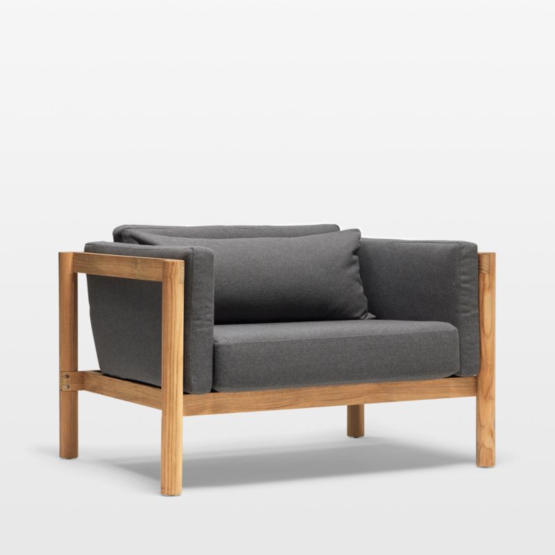 Angled at a slight recline, this deep-seated chair and a half invites you and a friend to kick back and enjoy the great outdoors. Boxy seat and back cushions upholstered in classic grey are curl-up comfy, while slim side bolsters add a soft layer for draping arms. Natural teak shapes the chunky, rounded frame complemented by a hand-stretched polyester rope back. Offering living-room looks with surprising durability, the oversized outdoor chair withstands the elements in weather-resistant teak and fast-drying foam cushions.