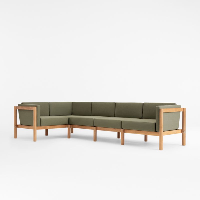 Space-saving yet deep-seated, this sectional sofa invites family and friends to kick back and enjoy the great outdoors. Boxy seat and back cushions upholstered in sage green are curl-up comfy, while the sectional sofa's slim side bolsters add a soft layer for draping arms. Natural teak shapes the chunky, rounded frames complemented by hand-stretched polyester rope backs that angle slightly for a comfortable recline. Offering living-room looks with surprising durability, the right-angled outdoor sectional withstands the elements in weather-resistant teak and fast-drying foam cushions.