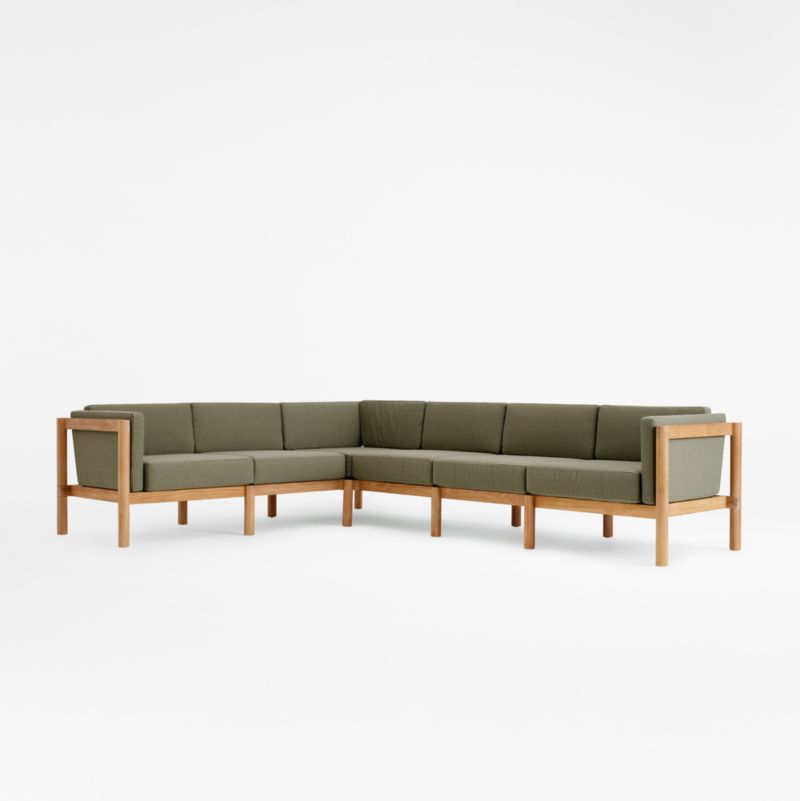 This large, deep-seated sectional sofa invites family and friends to kick back and enjoy the great outdoors. Boxy seat and back cushions upholstered in sage green are curl-up comfy, while the sofa's slim side bolsters add a soft layer for draping arms. Natural teak shapes the chunky, rounded frames complemented by hand-stretched polyester rope backs that angle slightly for a comfortable recline. Offering living-room looks with surprising durability, the L-shaped outdoor sectional withstands the elements in weather-resistant teak and fast-drying foam cushions.