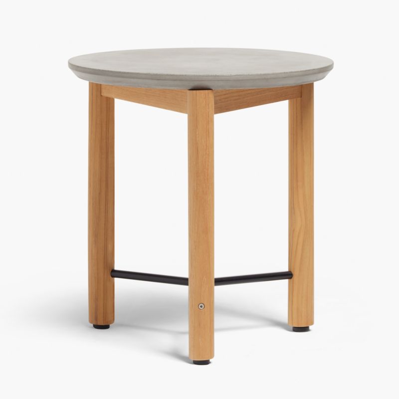 Designed to accompany our Neighbor Haven outdoor lounge collection, this end table mixes materials and shapes to provide the perfect complement. Natural teak shapes the rounded legs and tripod base, topped with a bull-nosed round of grey concrete. Iron stretcher bars add a touch of metal and support. Pair the side table with the matching coffee table for a coordinated outdoor living space.