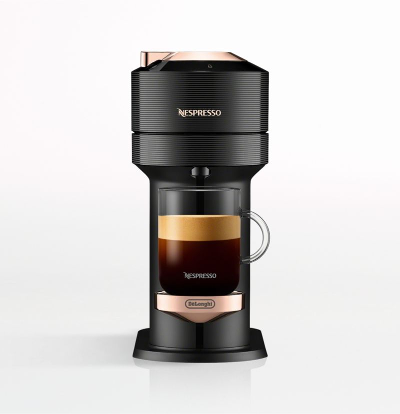 Crema, the frothy finishing touch on a perfectly pulled espresso, is now available for your morning cup of coffee. Using Nespresso's innovative Centrifusion extraction technology, the rose gold-accented Vertuo Next tops each coffee and espresso with a generous layer of the prized creaminess. This advanced machine brews drinks using coffee capsules, each of which includes a barcode that automatically adjusts the brewing parameters for ideal extraction. In sleek black with warm rose gold detailing, the compact Vertuo Next looks modern on coffee stations and countertops.