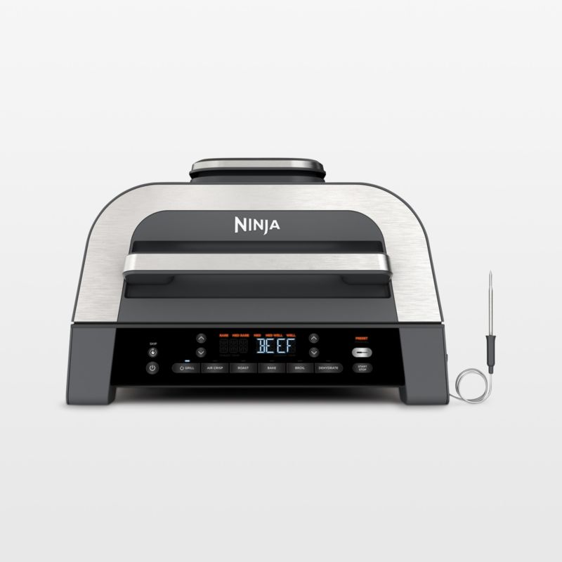 Grill food indoors with all of the deliciousness and none of the smoke or mess. Equipped with cyclonic grilling technology that circulates super-hot air, this innovative appliance cooks quickly and accurately to your preferred level of doneness. Your favorite foods go from frozen to perfectly char-grilled in under half an hour. In addition to grilling on the searing grate, this six-in-one unit also air crisps, roasts, bakes, broils and dehydrates. Use the crisper basket to make a batch of handcut fries with up to 75% less fat than their deep-fried counterparts, or dehydrate apple slices or venison jerky to create delicious snacks. No matter which cooking method you choose, the rapidly circulating air ensures food is cooked evenly, and the ceramic-coated grill grate, crisper basket and pot clean up easily. Constructed with pleasing curves in sleek black with metal accents, this extra-large cooker takes pride of place on the countertop so you can grill without hesitation.