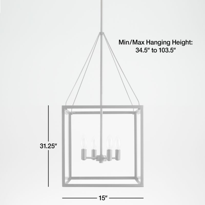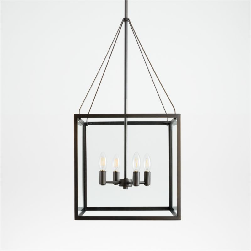 Paned in clear glass, our Nolan pendant frames a four-bulb chandelier in blackened steel. The crisp cube pairs with the rounded sockets and downrod for a ceiling light at once modern and traditional. Hang a single pendant over a breakfast nook, or line up multiples over a kitchen island or down a hallway. Our Nolan square black glass pendant light is a Crate & Barrel exclusive.