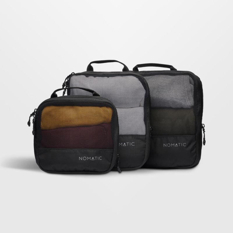 NOMATIC makes packing and travel as painless as possible with this thoughtfully designed set of black compression cubes. Constructed of lightweight-yet-durable mesh so you can see the contents at a glance, the three packing cubes use a zippered compression system to condense clothes and maximize space in your backpack, carry-on bag or checked suitcase.