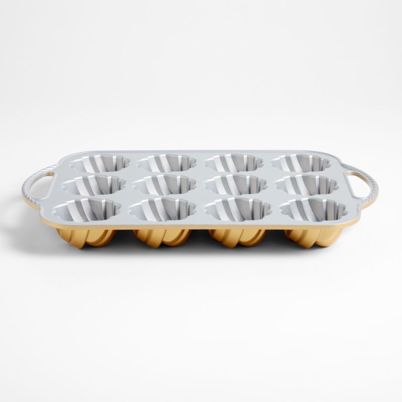 Create petite cakes worthy of celebration with this stunning Bundtlette pan finished in gleaming gold. Effortlessly creating a bold braided look, the woven pattern was designed for Nordic Ware's 75th anniversary to symbolize togetherness, continuity and strength. Bake up 12 exquisite desserts perfect for tea parties, brunches and sharing. Cast aluminum conducts heat evenly and keeps details sharp, while the reflective exterior ensures uniform browning. With sturdy handles for easy lifting and inverting and a non-stick interior for perfect release, this braided baking pan makes miniature Bundtlettes a breeze.