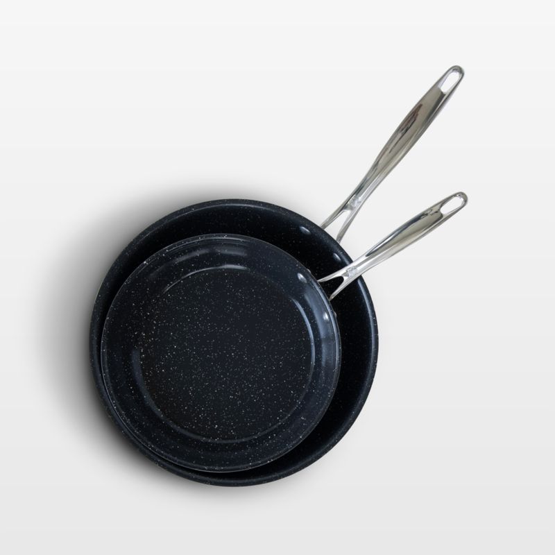 Legendary for bakeware, Nordic Ware brings the same excellence to cookware with this set of restaurant-quality saute skillets. Three ceramic layers give the restaurant-grade aluminized steel pans a non-stick finish that lasts. The black coating is showered with white speckles for a charming look reminiscent of classic campfire cookware. Fitted with stainless steel handles, the skillets go from stove to oven to table to serve eggs, sauteed mushrooms and more.