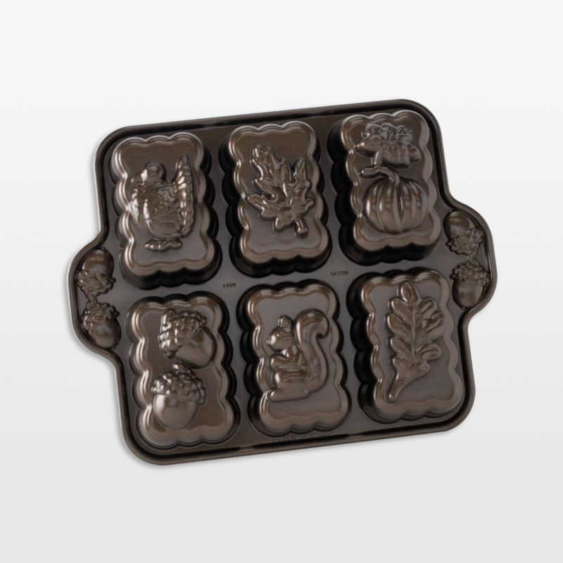 Make charming mini loaves of cakes and quickbreads for autumn breakfasts, Thanksgiving desserts and cozy coffee breaks. Baking up delightful sweet or savory additions to the fall table, the pan creates six petite loaves topped with dimensional acorns, leaves, turkey, squirrel and pumpkins. Cast aluminum keeps the details crisp, while the non-stick coating ensures a clean, easy release. The gorgeous pan makes a sweet and seasonal gift for your favorite baker.