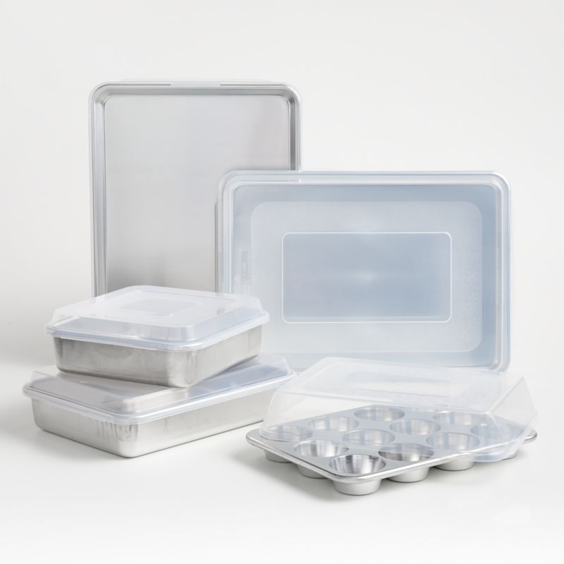 This handy set has all the basics needed to start or refresh a bakeware collection. The cake pans, half-sheet pans and muffin pan all come with lids, so baked goods stay fresh and can be easily toted to parties and potlucks. The Nordic Ware Naturals collection features classic baking pans in natural aluminum, which conducts heat evenly and never rusts. Reinforced, professional-grade bakeware will last through a lifetime of cookies, cakes, cupcakes, granola and roasted vegetables and chickens.