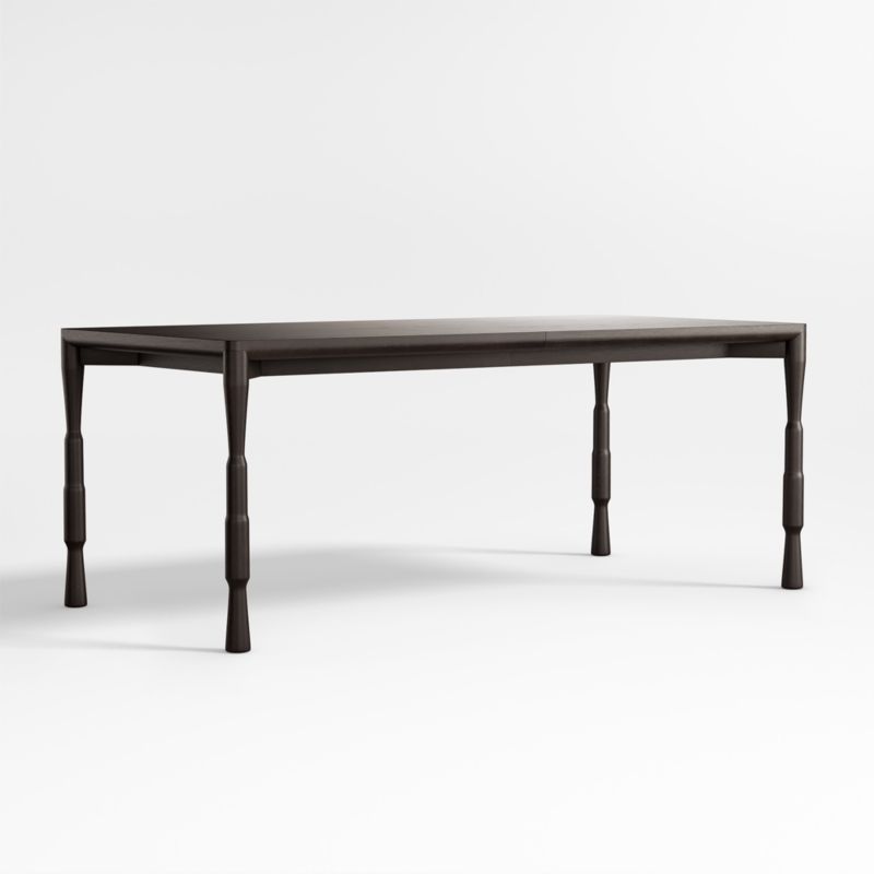 There's something undeniably classic about a turned-leg table. Our Norin dining table revitalizes this traditional favorite with elongated legs and streamlined turning for a sophisticated look that's contemporary yet timeless. Reverse bullnose detailing along the top edge adds to the woodworking details that invigorate the table's sleek, modern profile. A Crate & Barrel exclusive, the dining table, with an ebonized brown-black finish the color of rich espresso, extends from seating 8 to accommodating 10 diners.