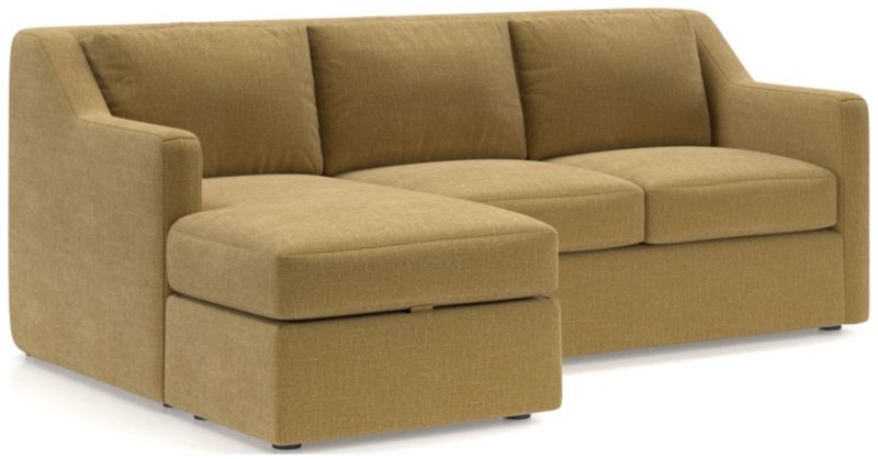 Notch's arms take a little dip, updating the classic sheltering sofa silhouette with clean lines and an open attitude. Casually comfortable, the sectional has a smaller footprint and reverses to suit your layout. Simply move the storage ottoman to the left or right side and flip the chaise cushion. Providing a slightly upright yet comfy sit, the sectional is tailored in a family-friendly basketweave of plush chenille for lots of touchable texture.