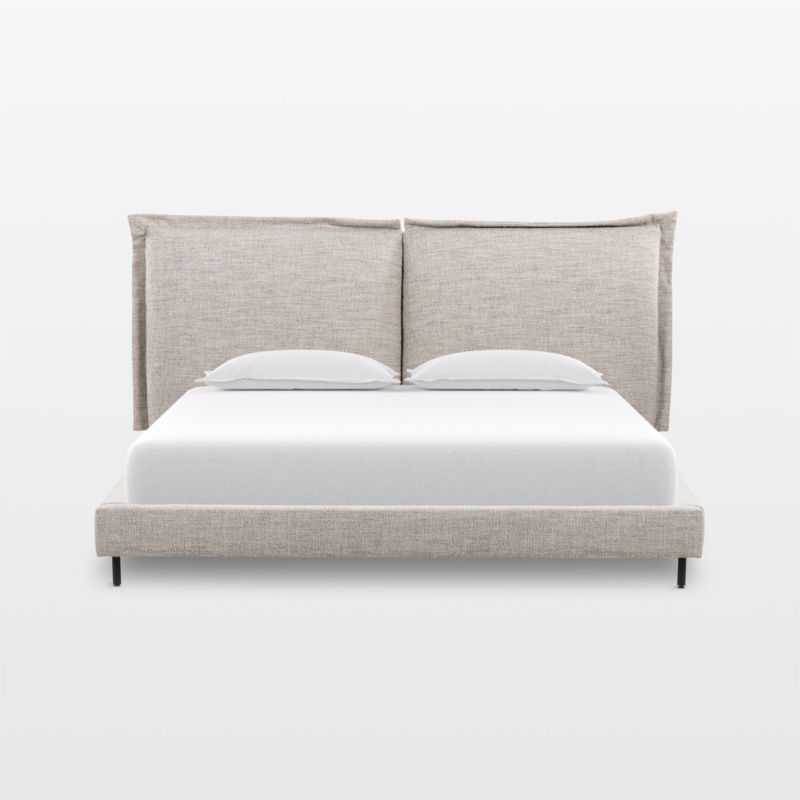 This modern bed's pillowy headboard is seamed down the center and trimmed with flange edges for a look that's relaxed yet perfectly tailored. The design continues along bed rails covered in the same textured fabric in a decor-friendly shade of grey. A waxed ebony finish on the metal legs adds subtle contrast. Fully upholstered in the back, the bed can be positioned in a variety of ways to suit your space.