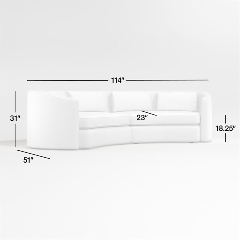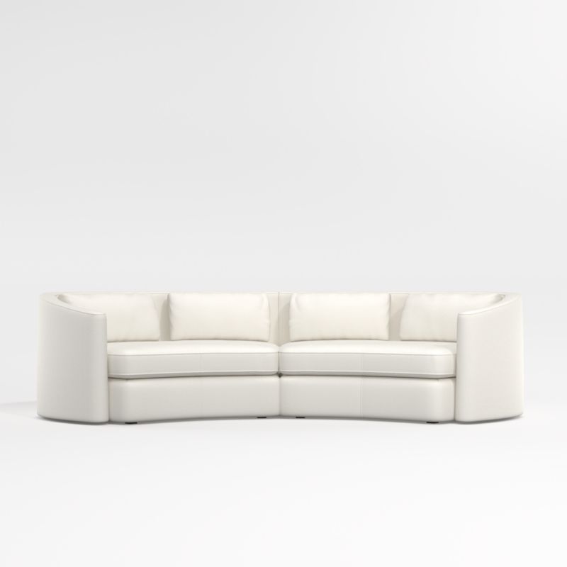 Our Nouveau sectional is a curvy, style-forward stunner that invites you to unwind with open arms. The combination of right- and left-arm sofas sweeps a fluid curve from arm to back, hosting squishable back pillows that are scaled slightly smaller to enhance the effect. With soft yet firm cushions that sit somewhere between upright and loungey, the two-piece sectional makes itself at home in casual and more formal settings. Upholstered in a performance polyester fabric made from recycled plastic water bottles, the Nouveau sectional sofa is a Crate & Barrel exclusive.